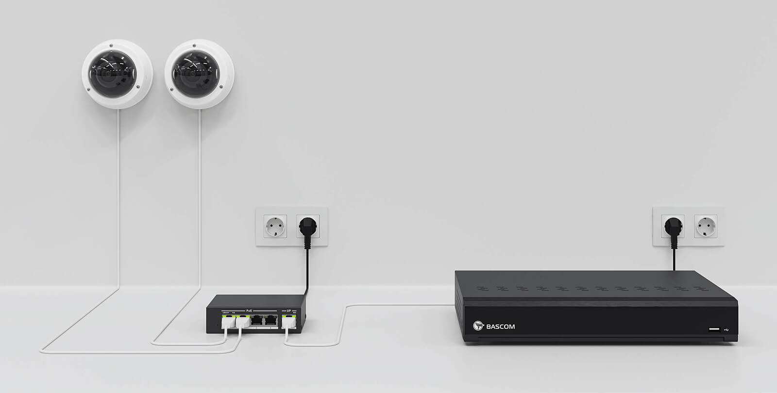 Mit einem PoE-Switch können Sie Ihr Kamerasystem nahtlos in ein bestehendes Netzwerk integrieren. Der Switch verbindet die Kameras mit dem Netzwerk und versorgt sie gleichzeitig mit Strom. Durch Anschließen des Rekorders an das Netzwerk wird automatisch eine Verbindung zu den Kameras hergestellt.